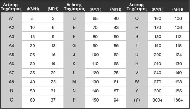 Πίνακας δείκτη φορτίου και δείκτη ταχύτητας ελαστικών