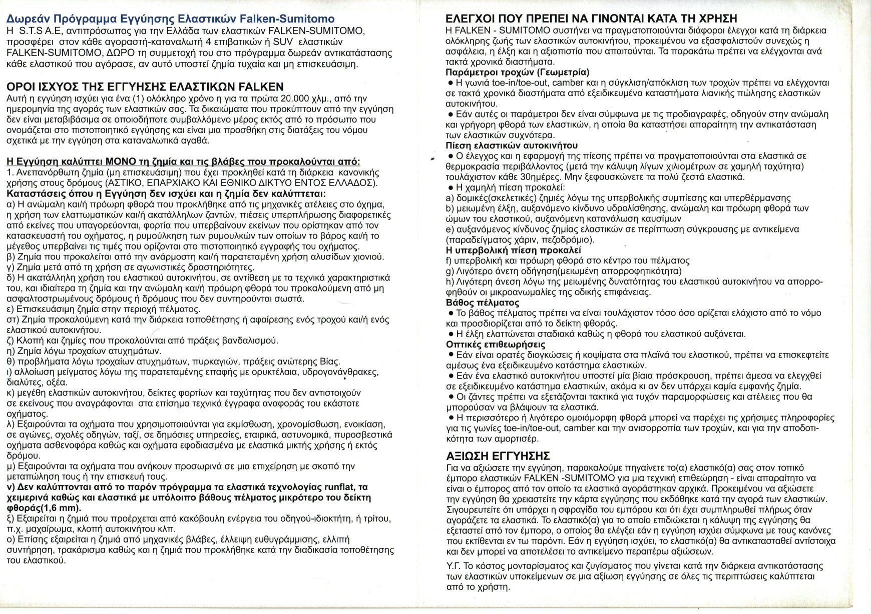 Δεν καλύπτεται η ζημιά που προκαλείται μετά από κλοπή, φωτιά, ατύχημα του υπαγόμενου αυτοκινήτου ή κακόβουλη ενέργεια ή από μηχανικές βλάβες, όπως ελαττωματικά αμορτισέρ,έλλειψη ευθυγράμμισης και λόγω ελλιπούς συντήρησης ή λανθασμένης πίεσης αέρα, αντίθετα με τιςπροδιαγραφές του κάθε ελαστικού. Δεν καλύπτονται ζημιές του ελαστικού που έχουν προκληθεί σκοπίμως και με υπαιτιότητα του καταναλωτήή λόγω κακής ή παράνομης χρήσης (ενδεικτικά αυτοσχέδιοι αγώνες, burnout κλπ).Οχήματα που δεν καλύπτονται από το πρόγραμμα εγγύησης:Δεν καλύπτονται: Βαριά οχήματα (άνω των 2.500 κιλών) ΤΑΧΙ, Οχήματα που χρησιμοποιούνται για εκμίσθωση, χρονομίσθωση και ενοικίαση,που συμμετέχουν σε ερασιτεχνικούς ή επαγγελματικούς αγώνες, σχολές οδηγών, μεταφορά εμπορευμάτων, δημόσιες υπηρεσίες,οχήματα Αστυνομίας, Πυροσβεστικής και ασθενοφόρα, που φέρουν Ελαστικά εκτός δρόμου (20-80), Ελαστικά επαγγελματικών οχημάτων και ημιφορτηγών.Διαδικασία έγκρισης της εγγύησης.Ο καταναλωτής απευθύνεται στον αντιπρόσωπο FALKEN - SUMITOMO από τον οποίο αγόρασε και από τον οποίο τοποθετήθηκαν τα ελαστικά,επιδεικνύοντας την κάρτα εγγύησης,συμπληρωμένης και σφραγισμένης κατά τα ανωτέρω, καθώς και το τιμολόγιο / φορολογική απόδειξη.Ακολουθεί η Τεχνική Επιθεώρηση δηλαδή το ελαστικό εξετάζεται από τον αντιπρόσωπο-έμπορο, ο οποίος θα ελέγξει εάν η εγγύηση ισχύει σύμφωνα με τους όρους του παρόντος και αν η βλάβη του ελαστικού είναι επισκευάσιμη.Εάν η εγγύηση ισχύει, το ελαστικό θα αντικατασταθεί και δεν μπορεί να αποτελέσει αντικείμενο περαιτέρω αξιώσεων, ήτοι δεν καλύπτεται εκ νέου το ελαστικό αυτό από την εγγύηση.Αν αντίθετα πρόκειται περί μικροζημιάς που επιδέχεται επέμβασης εσωτερικά και δεν απαιτείται να γίνει ολική αντικατάσταση του ελαστικού δεν αναγνωρίζεται δικαίωμα αντικατάστασης. Σημ: Οι διατρήσεις, τρύπες από καρφιά ή τα σκισίματα έως 0,64 εκατοστά συνήθως μπορούν να επισκευαστούν,εάν η βλάβη περιορίζεται στο πέλμα.